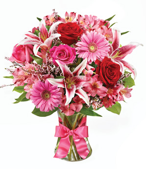 กุหลาบแดง กุหลาบชมพู แซมด้วยสไปเดอร์และอื่นๆ แจกันแก้วทรงกลมสูง 10-12cm
