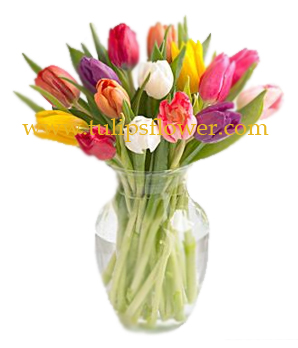 ทิวลิปสีชมพู 10 ดอก สีเหลือง10ดอก สีแดง10 ดอก จัดกับแจกันทรงกระบอก